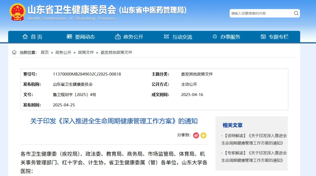 近日,山東省十部門聯合發布關于印發《深入推進全生命周期健康管理工作方案》的通知,確定在山東省深入推進全生命周期健康管理工作,探索優化全民健康管理機制,實施全生命周期綜合干預。